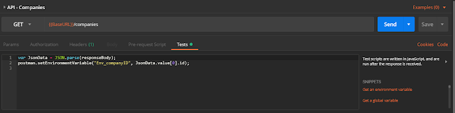 I have used a small JavaScript to store the company ID based on the response body. You can achieve this by simply navigating to Test tab and pasting the below script. What this script does it, it cast “responseBody” to a JSON data and then read the company id and the value to “Env_companyID” variable.