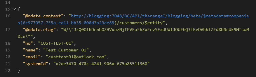 Then make a POST request with a sample JSON body and pass the No, Name, Email and D365 Sales Entity Record ID as SystemId.